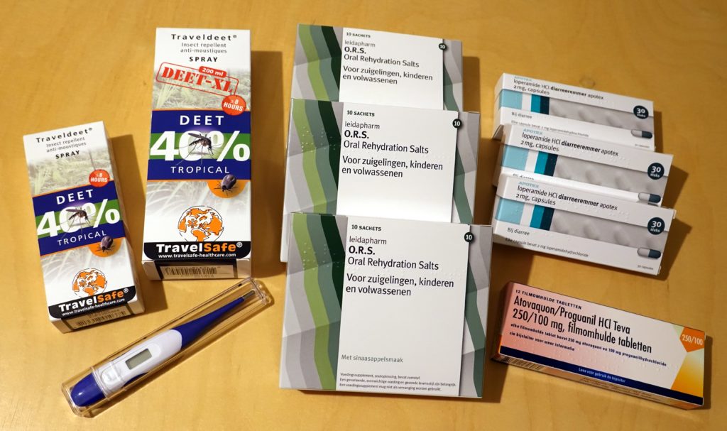 Toch zou het kunnen dat één van ons ondanks alles malaria gaat krijgen. Om dat vast te kunnen stellen nemen we een koortsthermometer mee. En als eerstelijns bestrijding een kuur die wij op recept van de reizigersarts hebben gekregen (nou ja, gekocht). Daarna zullen we ons moeten overgeven aan de lokale geneeskunde.
