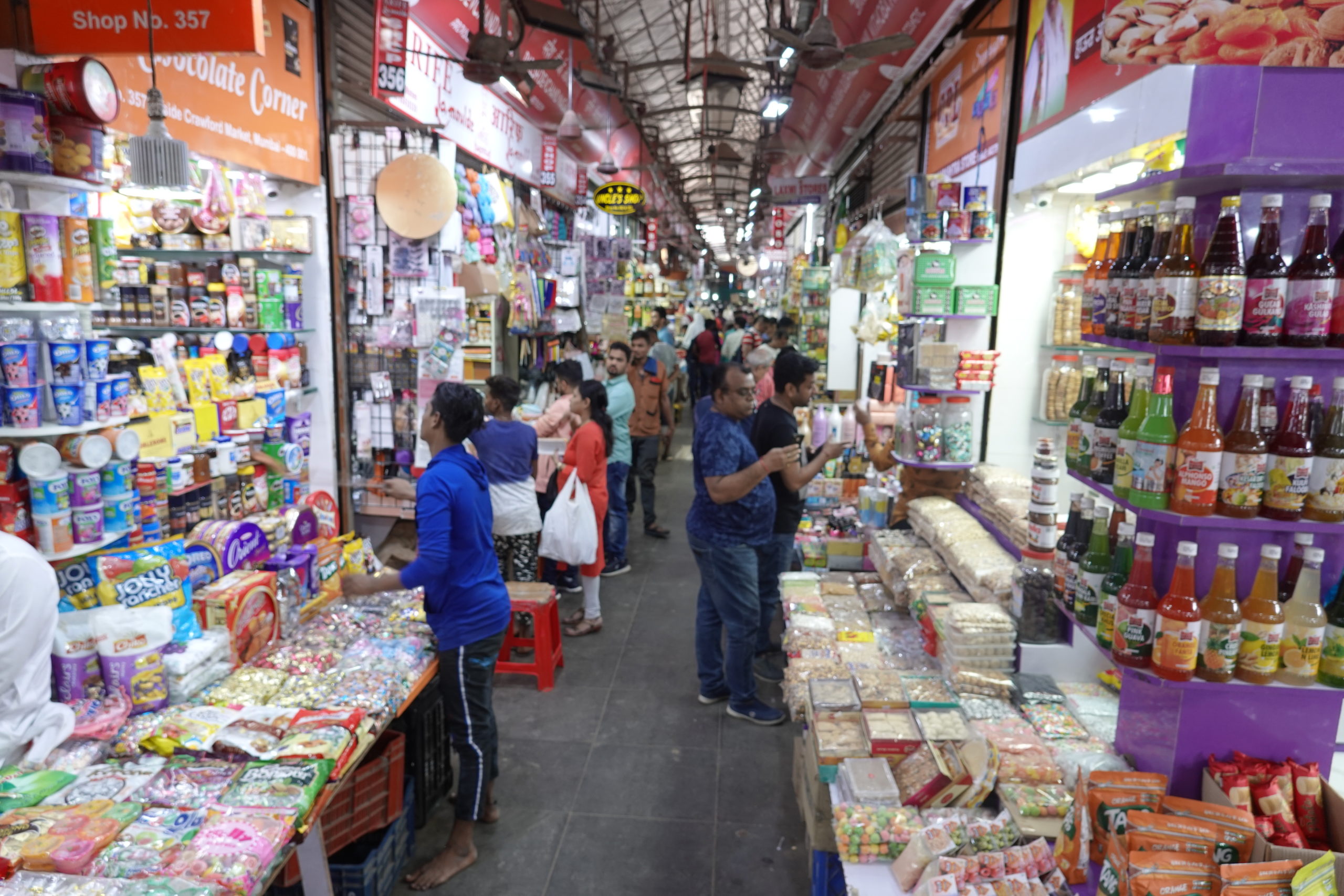 Voordat we de overdekte Crawford Market in kunnen, moeten we een wel heel erg drukke weg oversteken. Even een gaatje zoeken om die overtocht te maken. We hebben namelijk geleerd dat als je bij een redelijk gelegenheid rustig begint te lopen, ieder daarna gewoon om je heen laveert en je het leven aan de overzijde normaal kunt voortzetten.