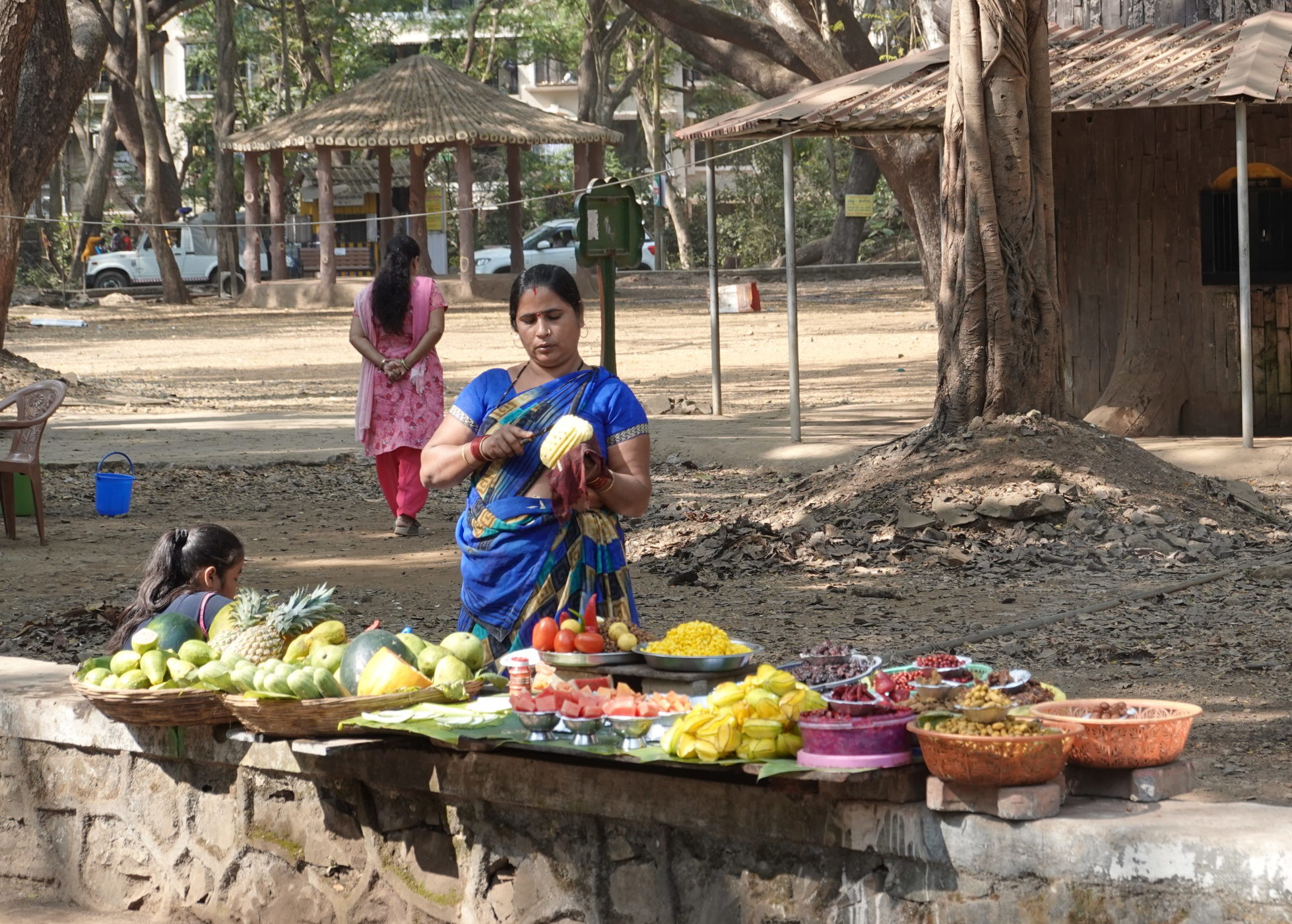 Een kleine troost is dat we voorbij een dame komen die vruchten te koop heeft; prachtig om te zien.