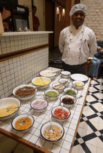 Terug in het hotel wacht ons een Indiase versie van een high tea. Het blijkt een veilige (met betrekking tot onze magen) versie van het straatvoedsel wat door Indiërs tussendoor als snack wordt gegeten. Een deskundige kok adviseert ons bij het samenstellen van onze snack. Dat doet hij prima, want het smaakt heerlijk. Hoe krijgen die Indiërs dat toch steeds voor elkaar met dat eten?