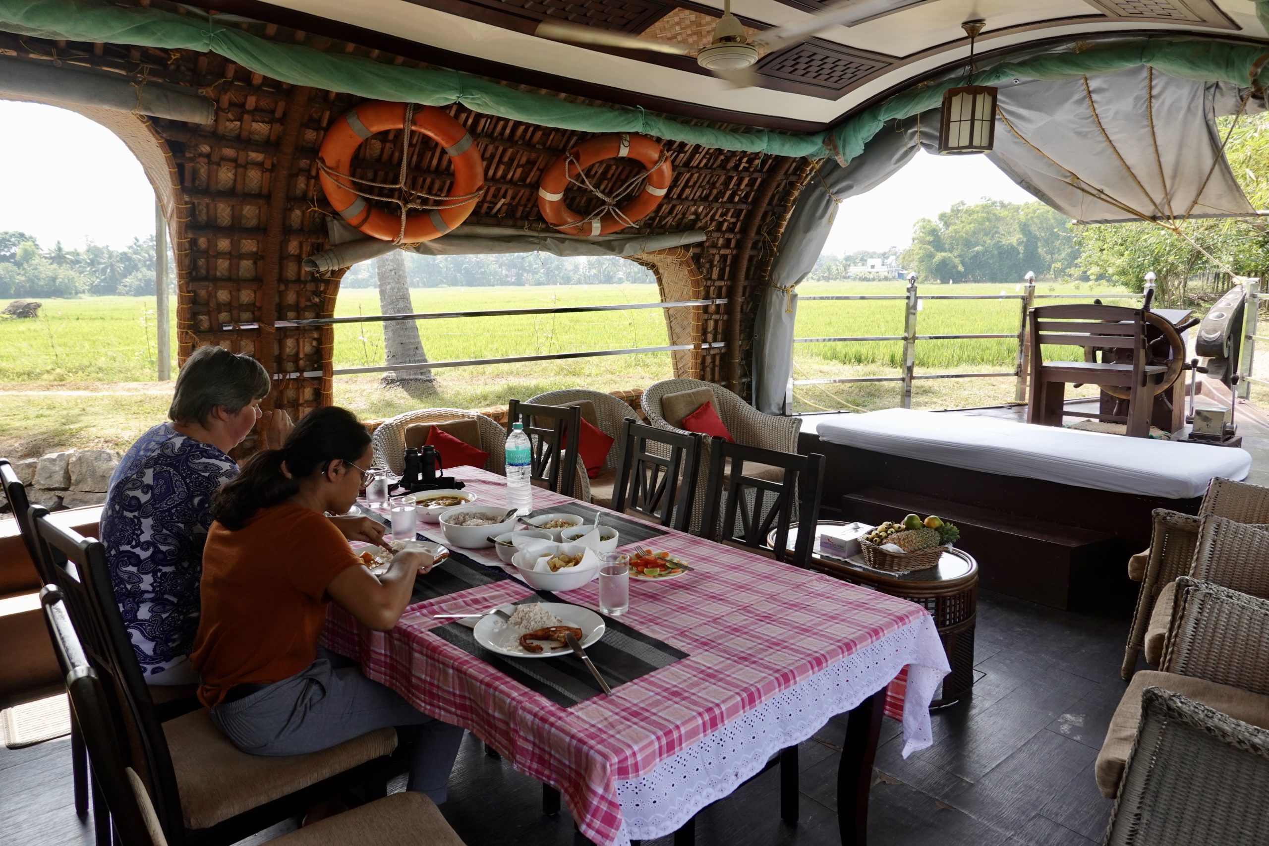 Dat is een bijzonder vaartuig om te zien! De wanden en het plafond zijn gemaakt van bamboestengels en gevlochten bamboebladeren. Er zijn drie slaapkamers en elke slaapkamer heeft een eigen badkamertje met toilet, wastafel en zelfs een douche. Achter in de boot is de keuken en voor in de boot staan makkelijke stoelen en een eettafel. De bemanning bestaat uit een kapitein, een kok en een assistent. Het is toch wat, drie bemanningsleden voor drie passagiers…