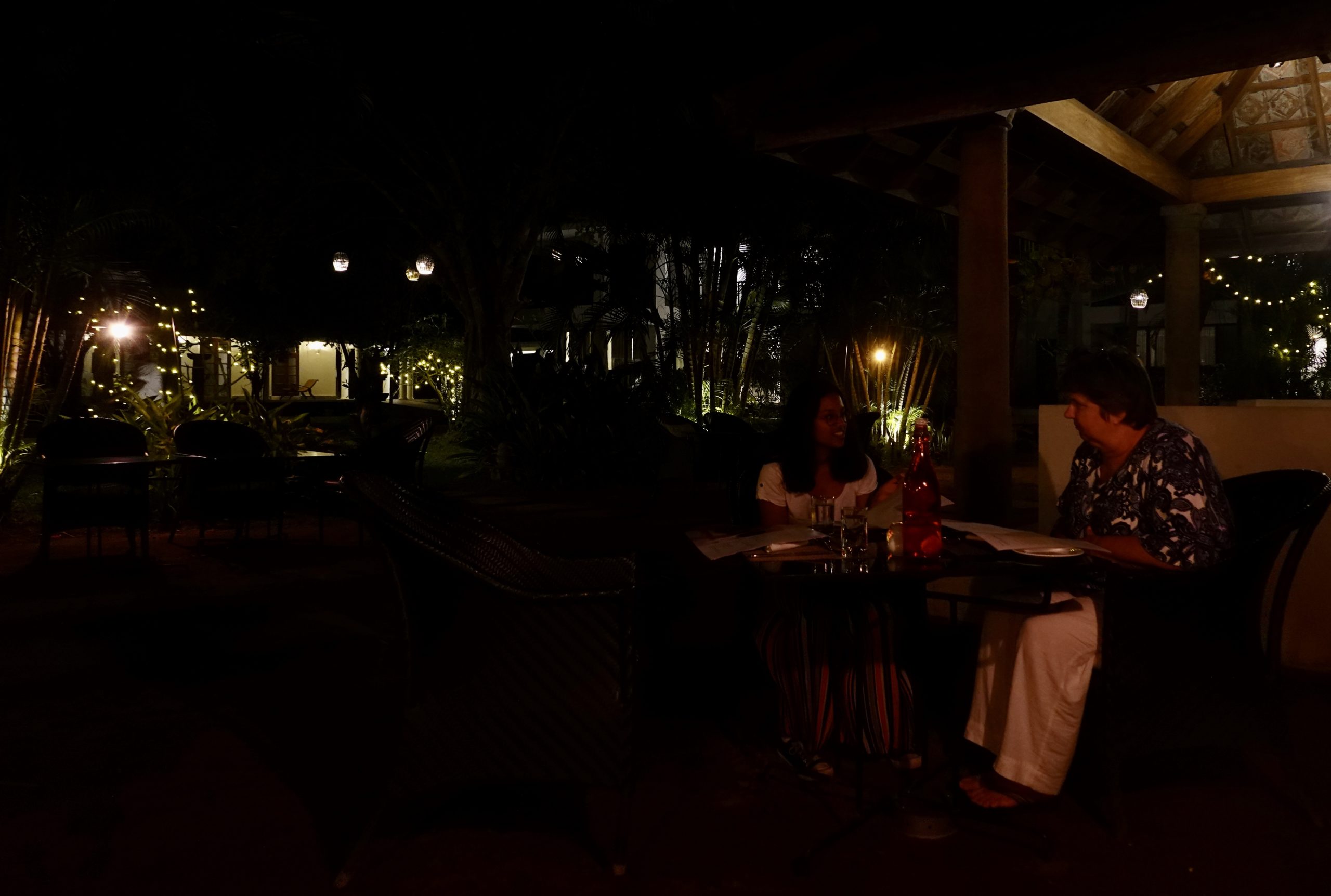 In de avond blijken we in de tuin te eten, die feestelijk verlicht is. Op de achtergrond klinkt zachte Indiase muziek.