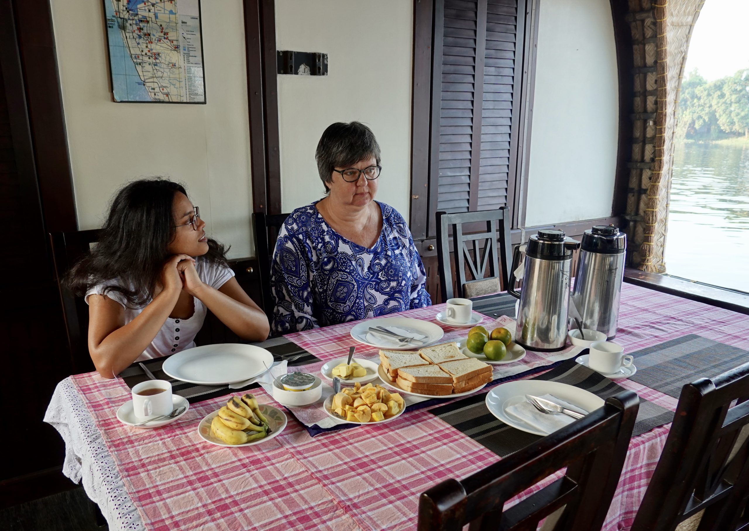 Om half acht staat er een heerlijk ontbijt klaar met toast, mangojam, fruit, thee en koffie. Na zoveel niets doen, gaat dit er goed in.