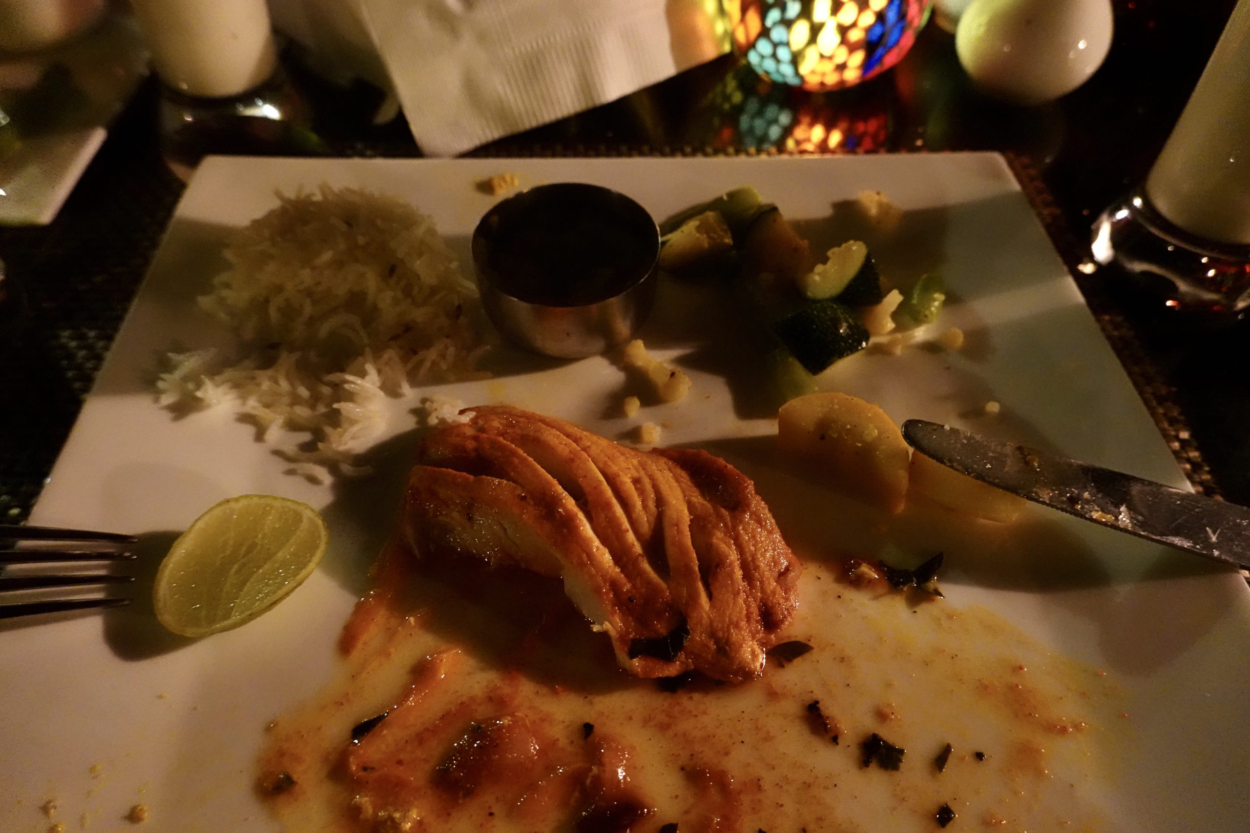 De kaart is behoorlijk uitgebreid, maar we besluiten voor het hoofdgerecht iets van de barbecue te kiezen. Zeker als blijkt dat dit geen vrolijk vlammende vleesverschroeier is, maar een uitgebreide buitenkeuken met serieuze kok. Arina bestelt Indiaas gemarineerde kip, Roos tonijn in botersaus en Jos Indiaas gekruide Keralaanse vis (Mahi-Mahi). De kwaliteit blijkt voortreffelijk.