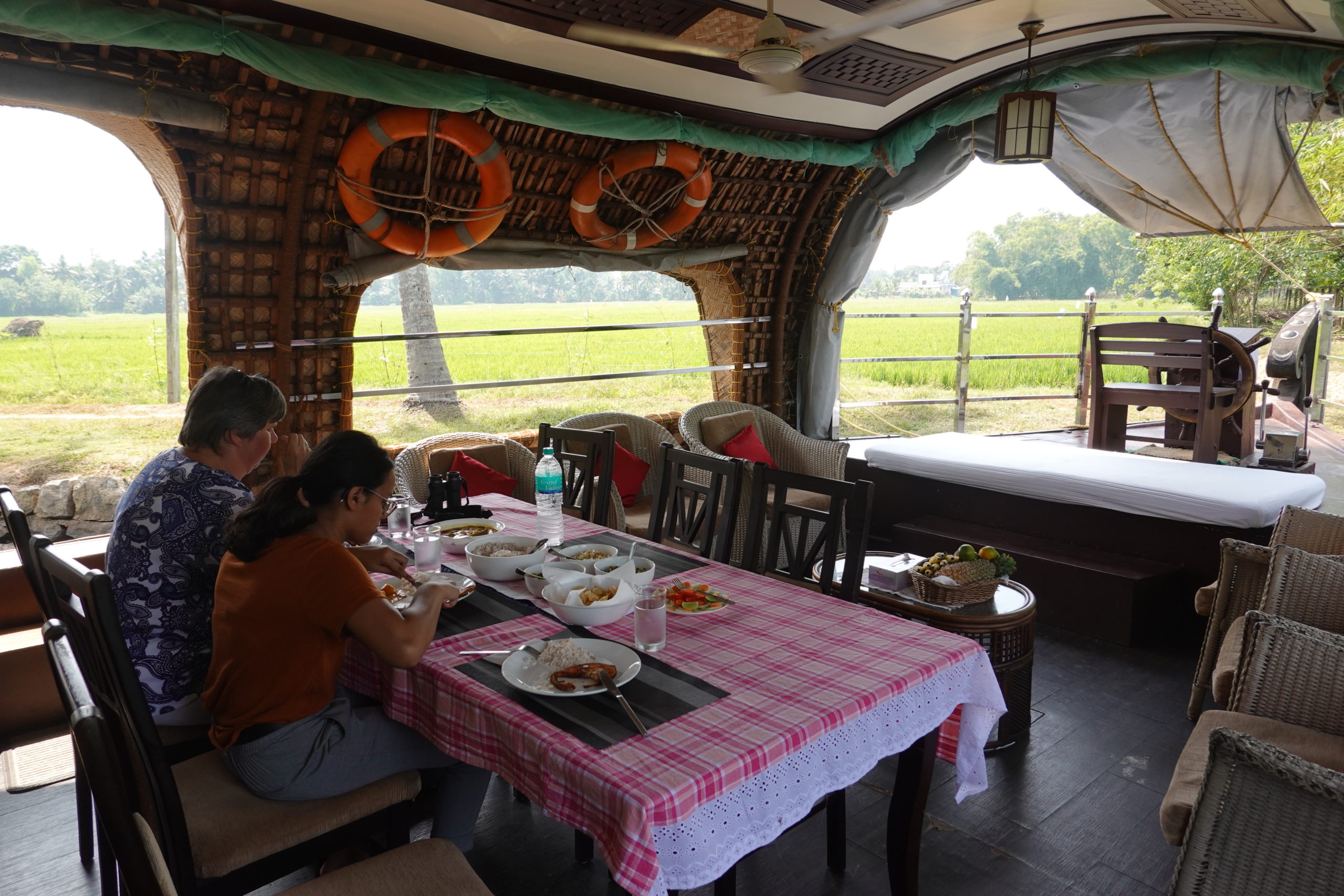 Tja, dat is best warm. En we hebben van tijd tot tijd echt wel, en soms wat langer, de beschutting van onze airconditioned kamer gezocht. Maar toch hebben we er niet van gebaald. Wèl werd het zwaar wanneer de luchtvochtigheid rond of soms zelfs fors boven de 90% kwam. Wat een drukkende bedoening was het dan. Met name in Kochi (zie het gelijknamige bericht) en Muhamma (zie Genieten) hadden we het soms wel even moeilijk. Behalve als je dan zonder beschermende kleding motor gaat rijden. Dat is dan weer helemaal tov!